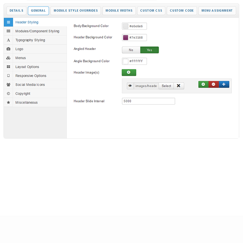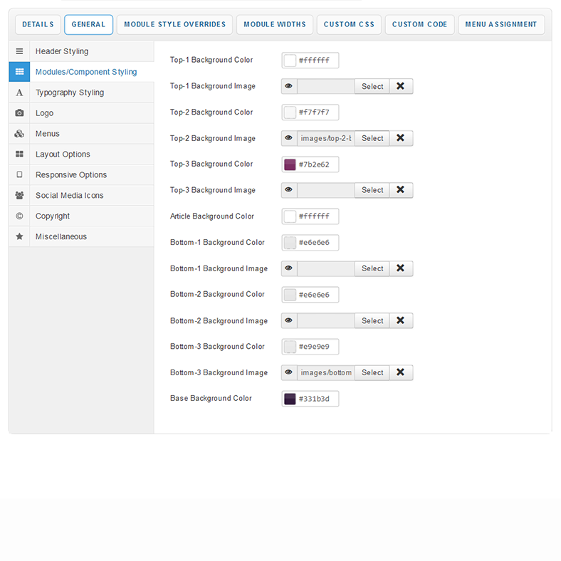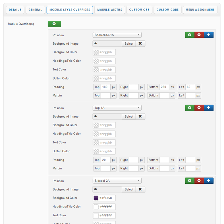 Module Style Overrides allow you to style individual module positions to your own taste. This greatly extends the control of how each of your module positions are displayed with a host of styling options including background image, background color, text color, heading color, button color and module padding. Multiple overrides can be created, each applied to the module position of your choice.