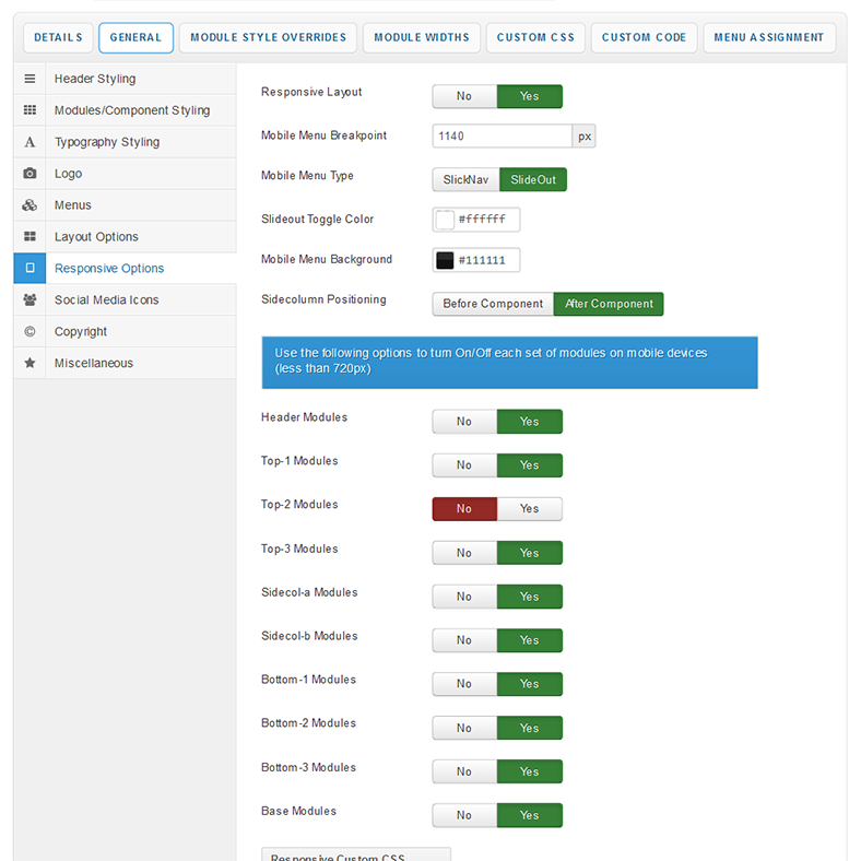 This template has a Reponsive design which allows it to automatically change its layout to best suit smaller screen devices. Options are available to turn enabling/disabling this feature. Disabled your template will be viewed on mobile devices the same as on your desktop monitor. Switchs are also available to enable/disable each row of modules on smaller screen devices.